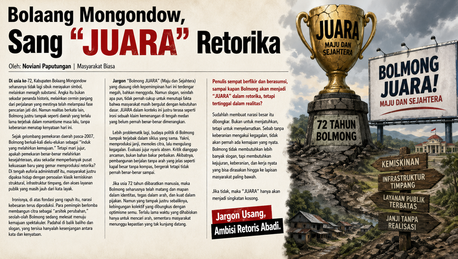 Jargon “Bolmong JUARA” (Maju dan Sejahtera) yang diusung oleh kepemimpinan hari ini terdengar megah, bahkan menggoda. Namun slogan, seindah apa pun, tidak pernah cukup untuk menutupi fakta bahwa masyarakat masih bergulat dengan kebutuhan dasar. JUARA dalam konteks ini justru terasa seperti ironi sebuah klaim kemenangan di tengah medan yang belum pernah benar-benar dimenangkan.